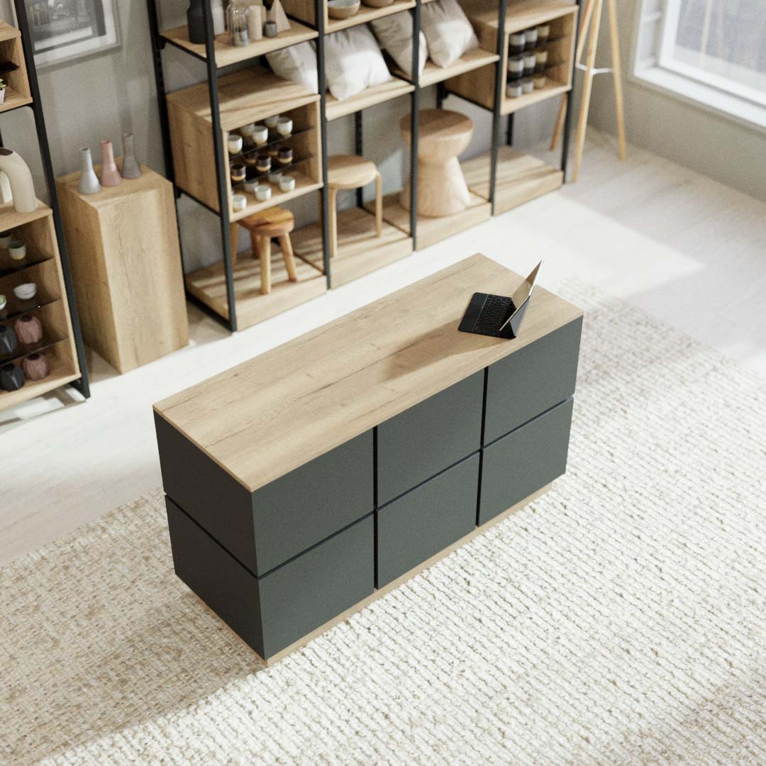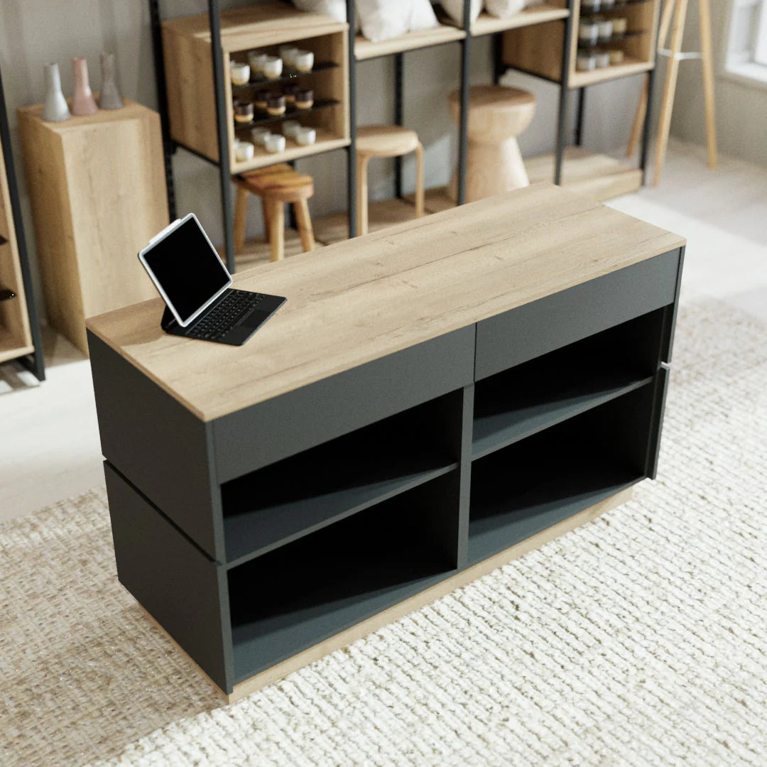 retail checkout counter, modern cash wrap station, 6ft wooden checkout desk, boutique counter furniture, minimalist POS counter, luxury retail counter, woodgrain shop counter, store cash desk, commercial sales counter, reception and billing counter