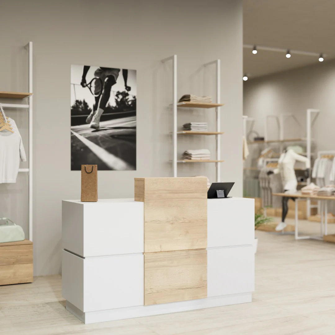 retail checkout counter, modern cash wrap station, 6ft wooden checkout desk, boutique counter furniture, minimalist POS counter, luxury retail counter, woodgrain shop counter, store cash desk, commercial sales counter, reception and billing counter