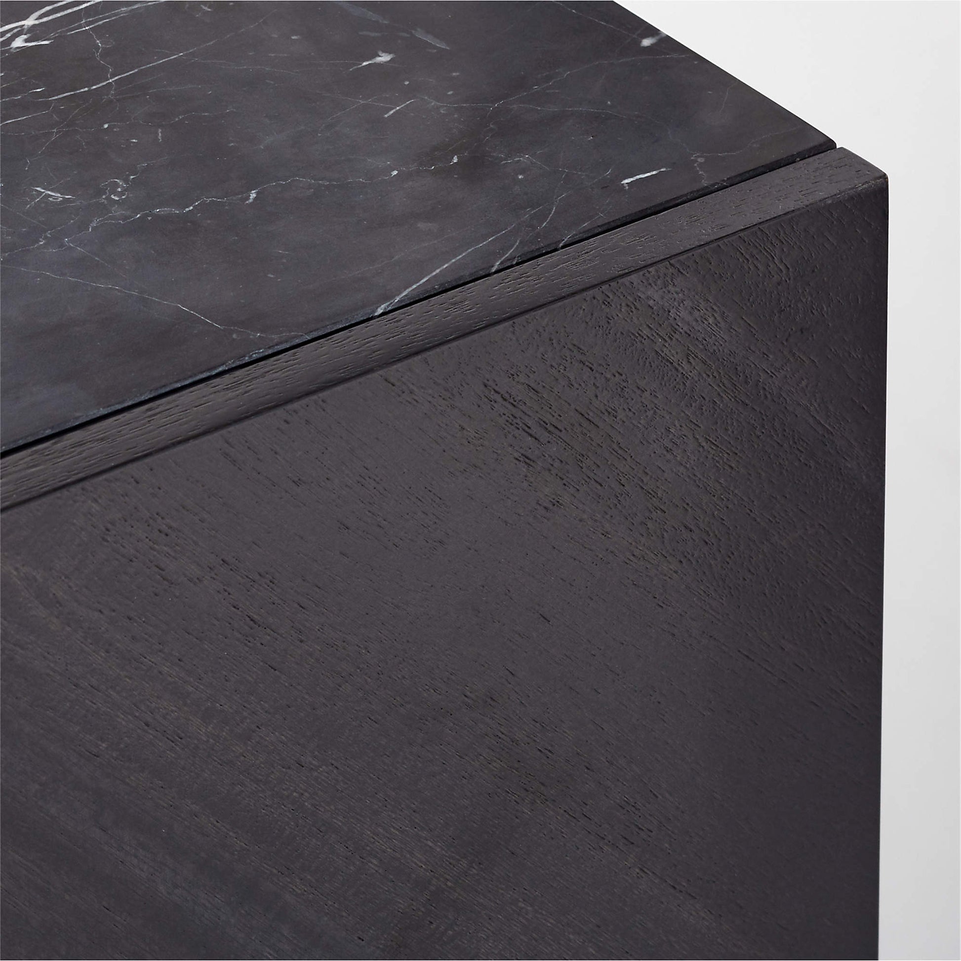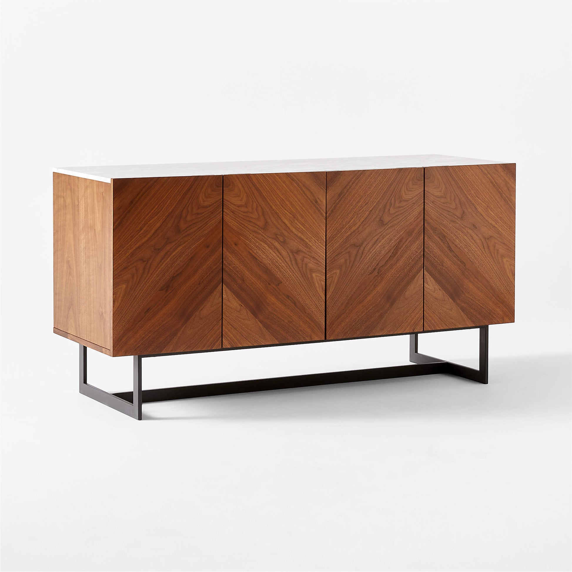 This four-door walnut media console spotlights the richness of natural materials with a marble top. Precisely cut panels of charcoal-finished walnut angle diagonally on the cabinet doors, creating an organic chevron pattern. Emphasizing the beauty of the wood grain, the doors open via discreet grooved channels to reveal two adjustable shelves inside. Shelves stop just short of the back of the console to feed cords through hidden cutouts with ease