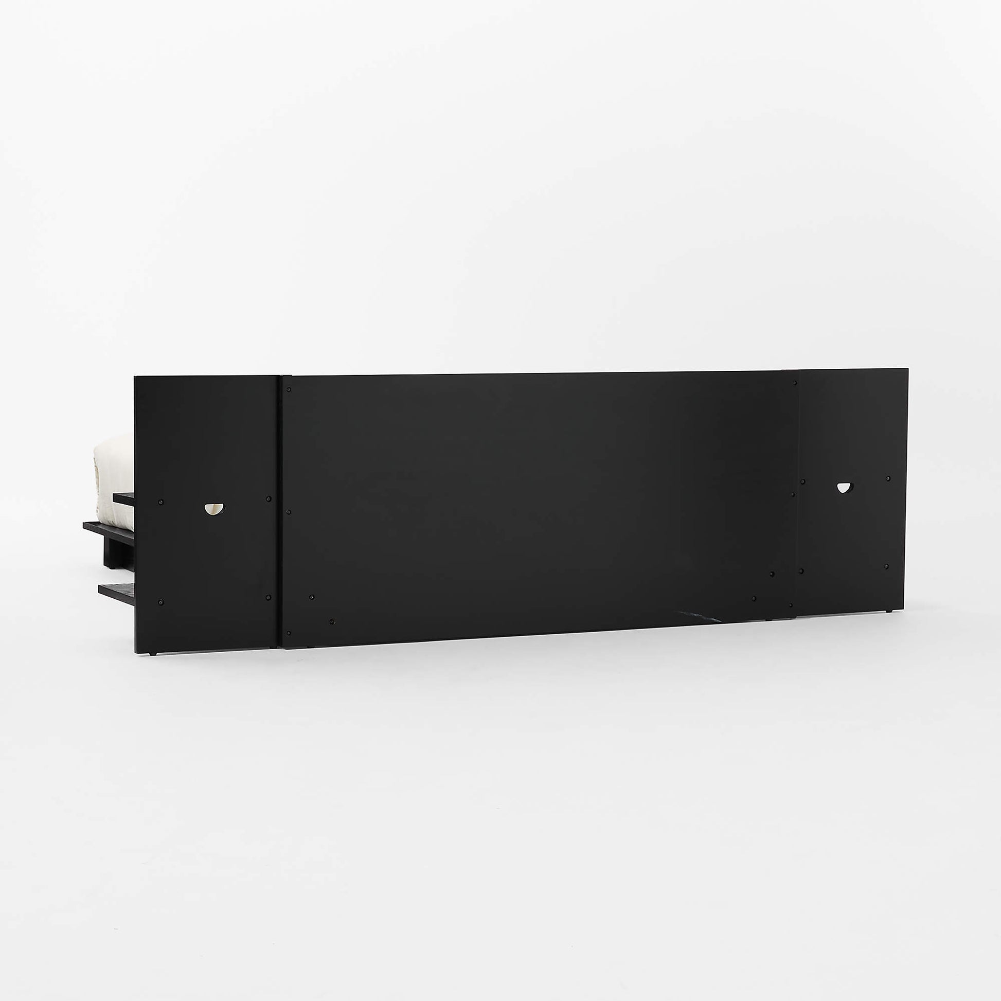 Acacia veneer platform bed integrates headboard nightstands with two cantilevered shelves each—one wide for books, one narrow with discreet cord cutouts for your light/phone/alarm clock. Ledge extends around mattress and hovers over corner block feet. Headboard is just the right height for pillow propping, too