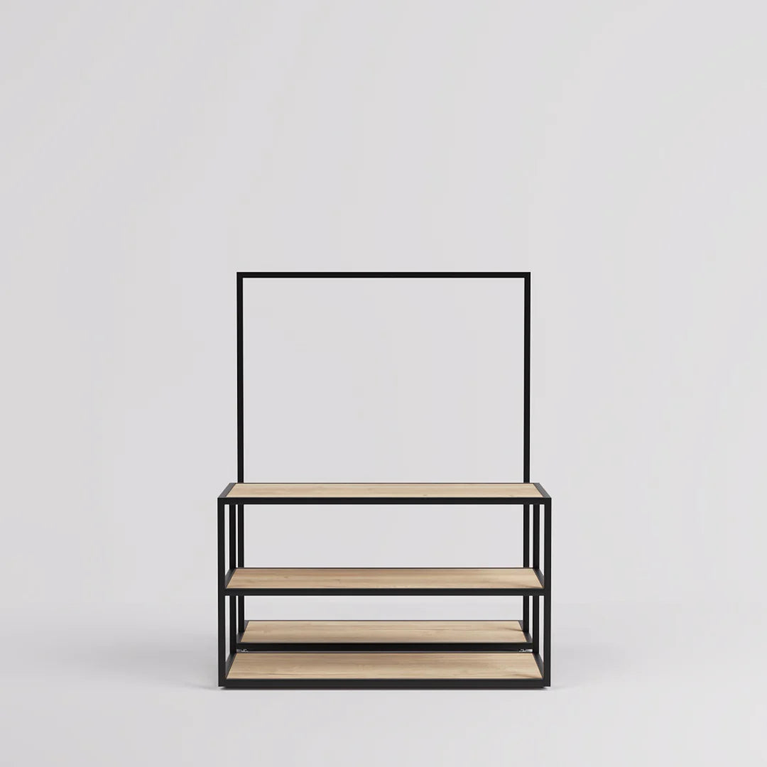Redefine your retail presentation with the Delta Nesting Table with Garment Rack, a sleek and versatile display solution designed for modern boutiques and fashion-forward stores. Featuring a minimalist black steel frame paired with warm oak-finish shelving, this piece seamlessly combines style and utility — perfect for showcasing apparel, accessories, and lifestyle collections in a clean, organized layout.