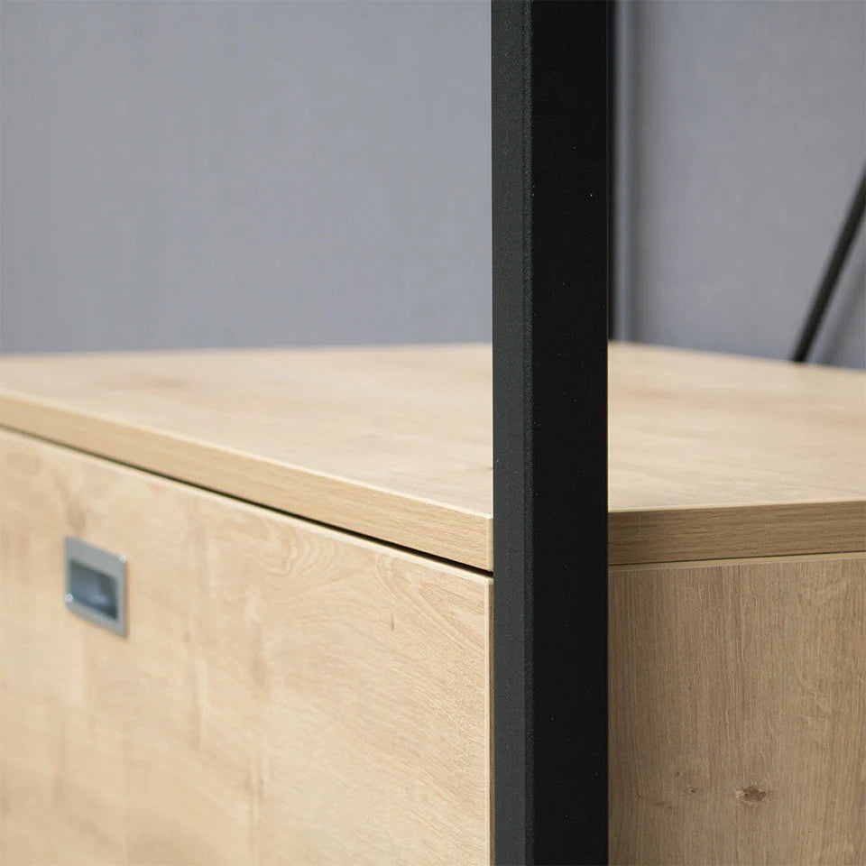 Modern Industrial Design: Black steel frame with warm wood accents complements any retail theme.