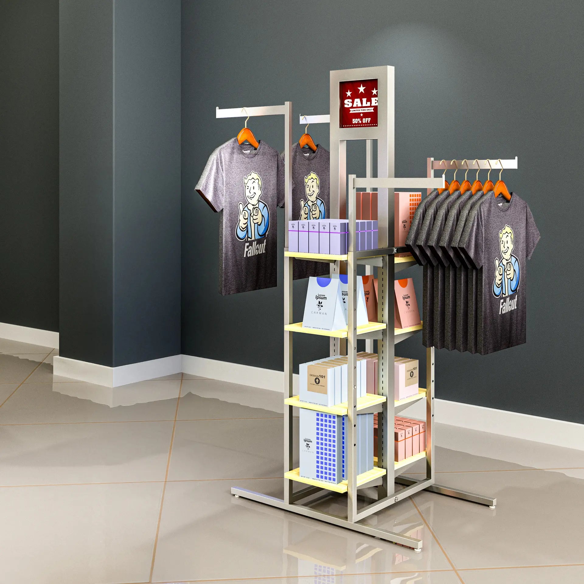 Multi-Display Functionality: Combines hanging arms and shelving for diverse product presentation.