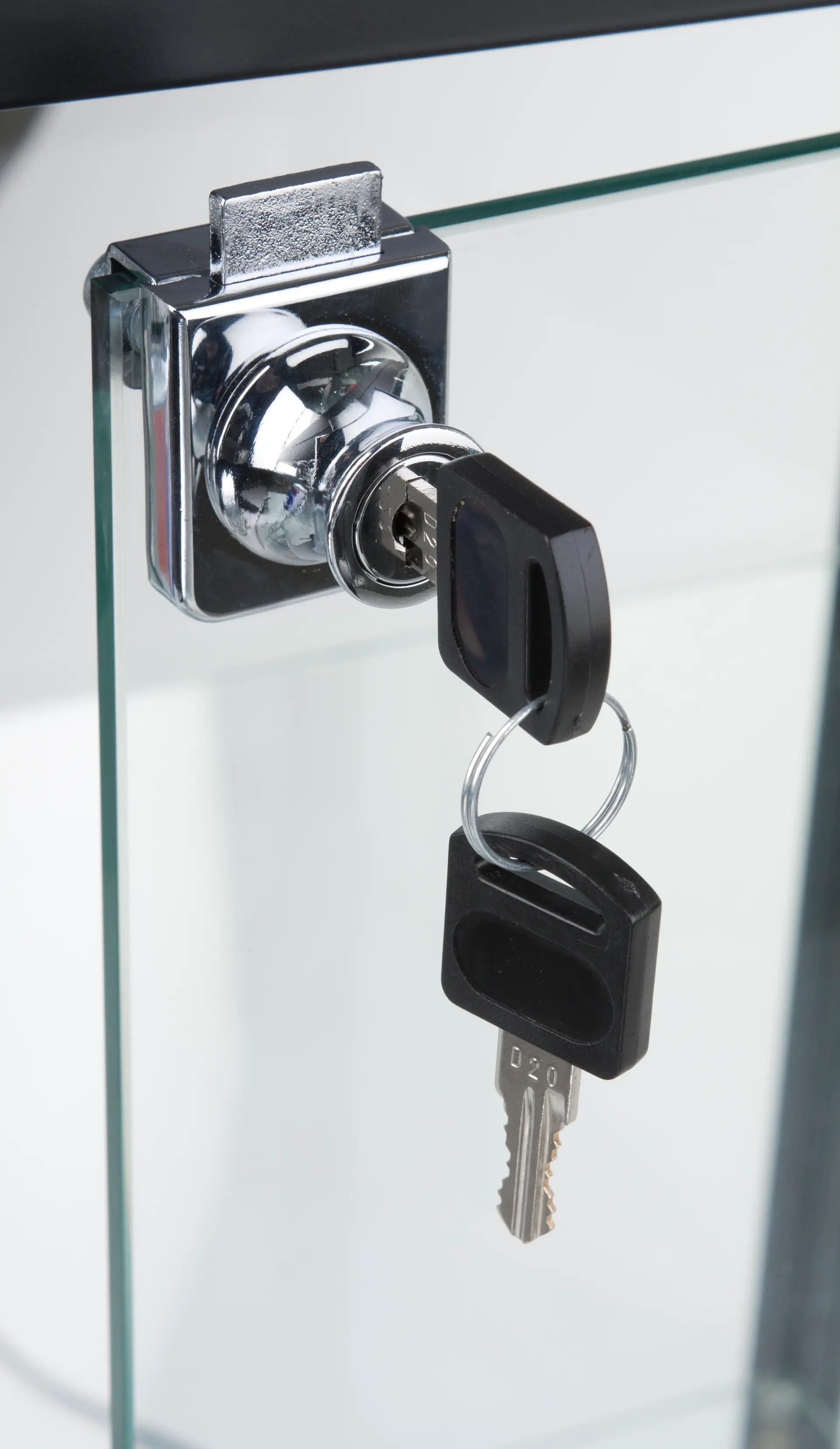 Tempered Glass Shelving: Three transparent tiers to display art, books, ceramics, or merchandise.