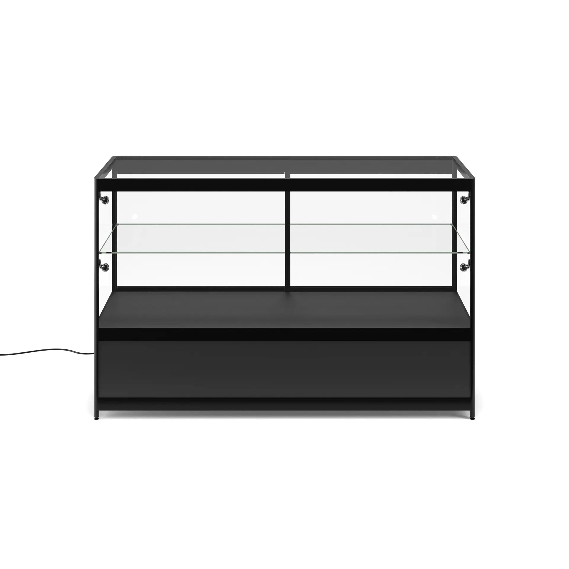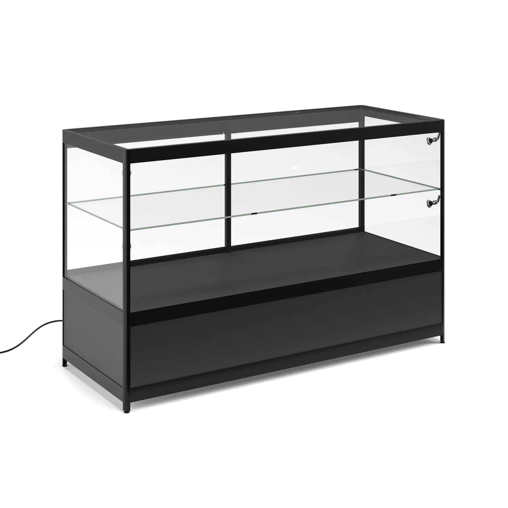 glass display showcase, modern retail counter, black metal display case, tempered glass cabinet, LED-ready display, countertop showcase cabinet, retail display furniture, minimalist glass showcase, store display counter, premium product display unit